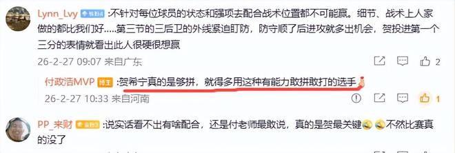 付政浩 认为,中国队下半场之所以能够逆转日本队,贺希宁和赵继伟的三分球起了关键作用,他在与球迷互动中充分肯定了贺希宁、赵继伟、廖三宁、胡金秋和朱俊龙的作用,称他们是取胜的五大功臣。他直言贺希宁真的是够拼,就得多用这种有能力敢拼敢打的选手。